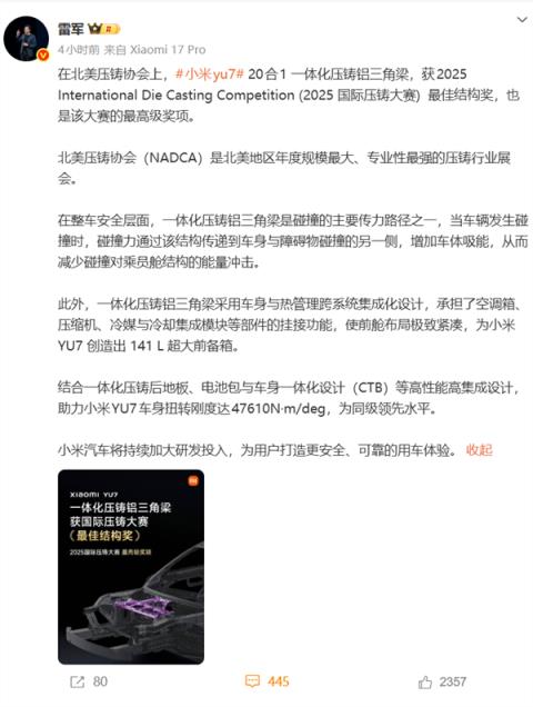 最佳结构!小米汽车再拿国际大奖:雷军发文详解 发布时间:2025-11-13