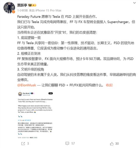 贾跃亭喊话马斯克:FF愿与特斯拉FSD合作 发布时间:2025-11-26