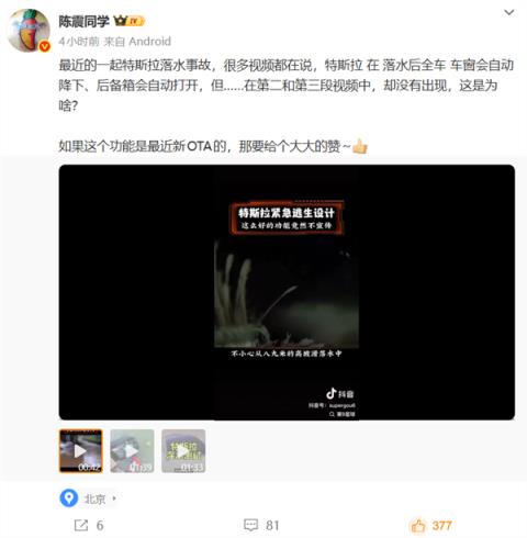 自媒体爆赞特斯拉落水自动降窗!陈震向客服求证:没听过有这个功能 发布时间:2025-11-26