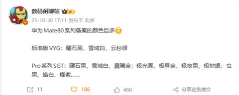 11月发布!华为Mate80系列备案配色出炉:黑、白、紫、金、银全都有 发布时间:2025-10-30