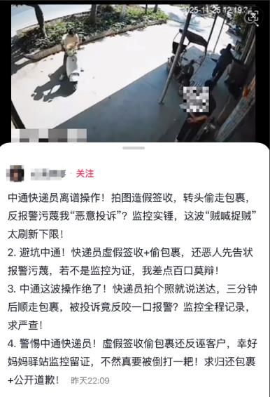 中通快递员偷走快递反诬陷客户 事主:差点百口莫辩 快递还没回来 发布时间:2025-11-27