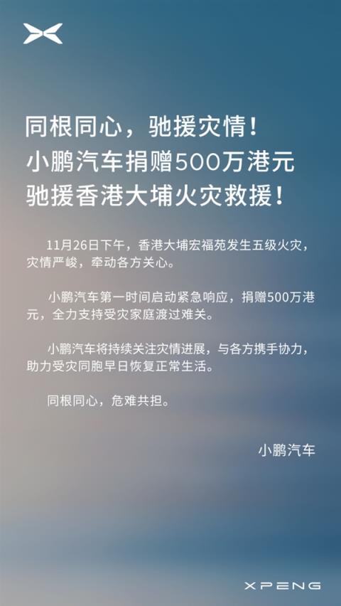 小鹏汽车捐赠500万驰援香港火灾救援 未来小鹏飞行汽车可加水灭火 发布时间:2025-11-27