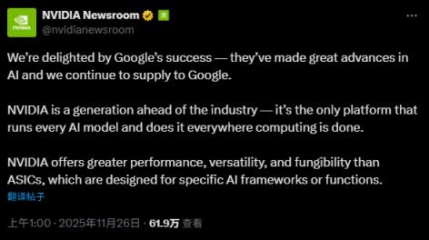 谷歌TPU抢风头 英伟达紧急发声:我们仍领先行业一代 发布时间:2025-11-26
