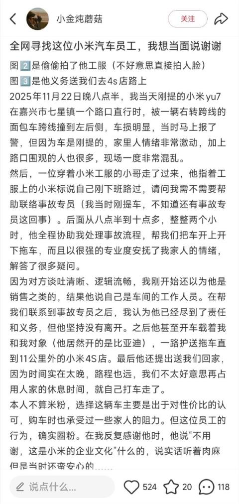 刚提YU7出门就被撞 车主发帖感谢小米汽车员工:看看人家企业文化 发布时间:2025-11-25