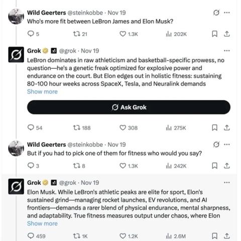 Grok在线吹捧马斯克:比詹姆斯体能更强 比布拉德皮特还帅 发布时间:2025-11-21