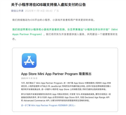 微信官宣:小程序将在iOS端支持接入虚拟支付 苹果仅抽成15% 发布时间:2025-11-14