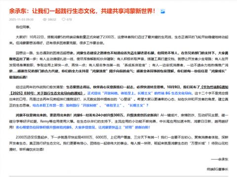 余承东致员工信:鸿蒙5终端设备突破2300万 迈过最关键的生死线 发布时间:2025-11-03