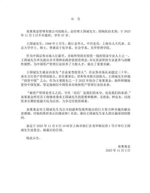 泉果基金创始人王国斌突然去世 年仅57岁 曾被评上海十大杰出青年 发布时间:2025-11-03