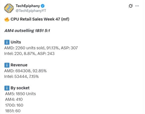 AMDCPU统治力无敌!9800X3D销量三倍碾压Intel全系 发布时间:2025-11-25